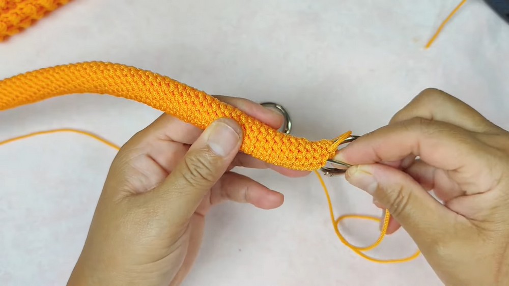 1. With the orange yarn, start on one side of the base.