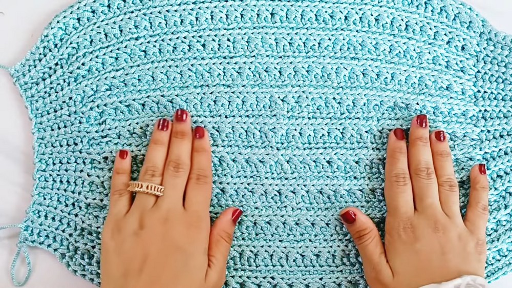 - Alternate between Row 2 (cross stitch row) and Row 3 (single crochet row) until the bag body measures 41 cm (16 inches) in length and 30 cm (12 inches) in width.