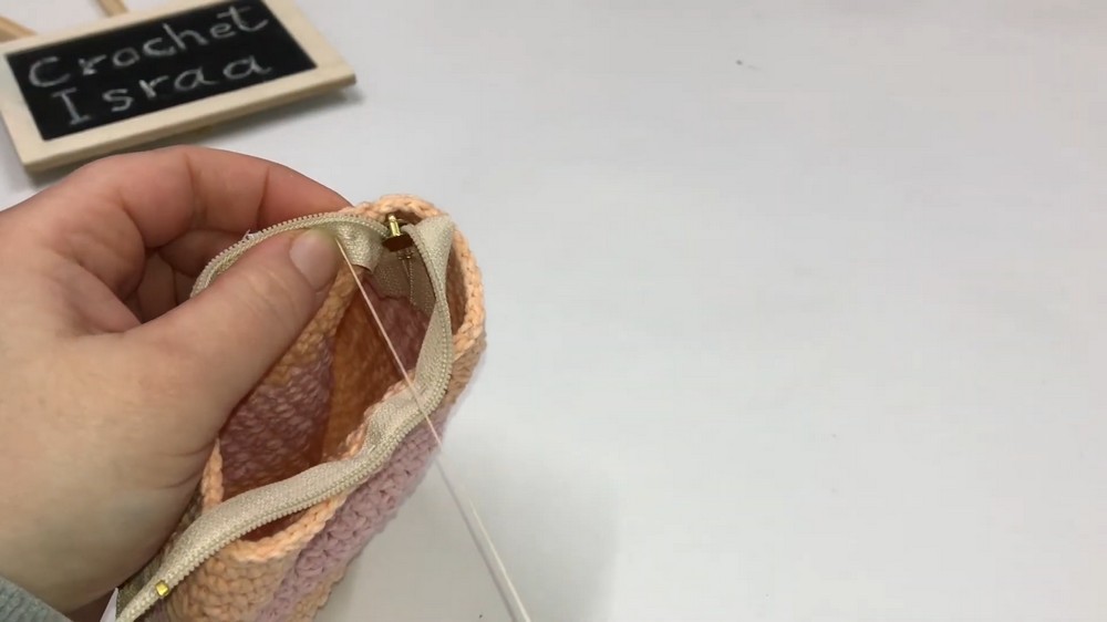 2. Using the needle and spare yarn or matching thread, sew the zipper into place securely along the edge.