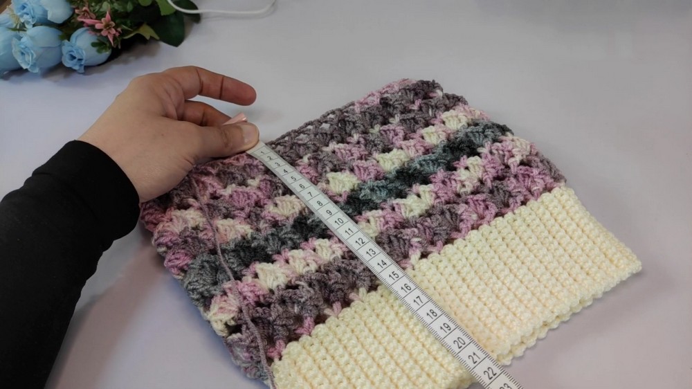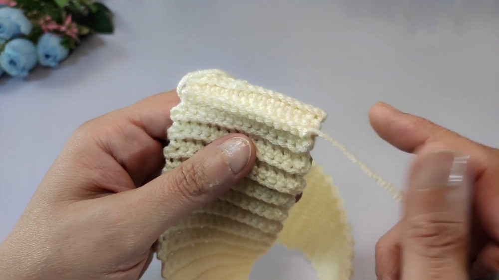 - Attach the medium-thickness yarn to the ribbed edge and switch to the 3.5mm crochet hook.