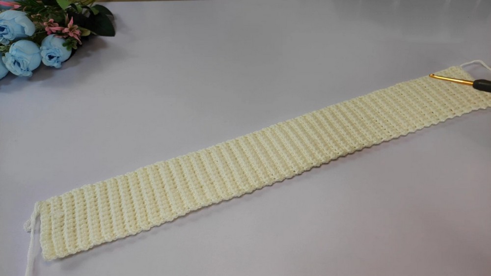 - Repeat Line 2 until the length of the band equals the circumference of the head minus 6-7cm for a snug fit. For example, as Salwa did, she worked 96 rows for a 47cm band length.