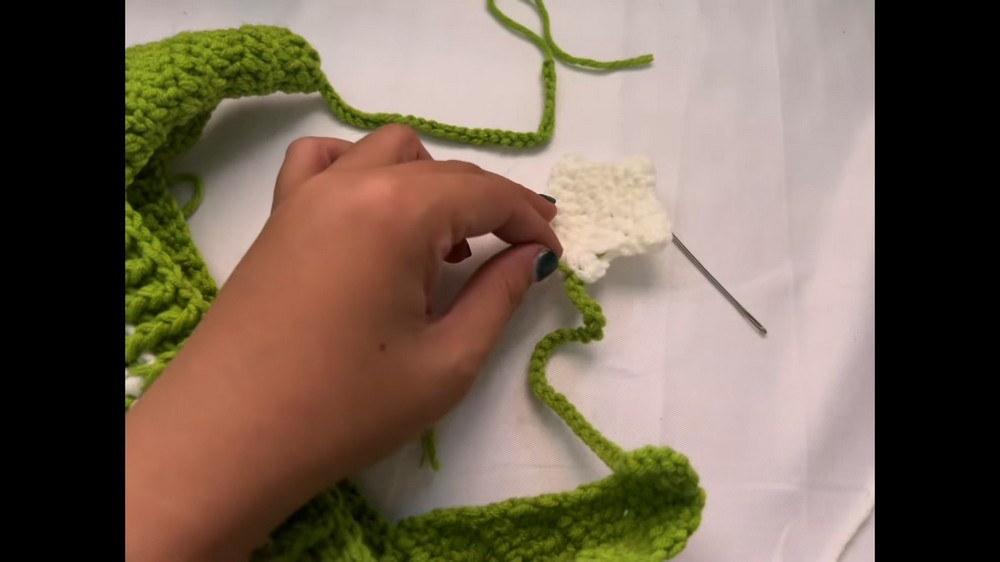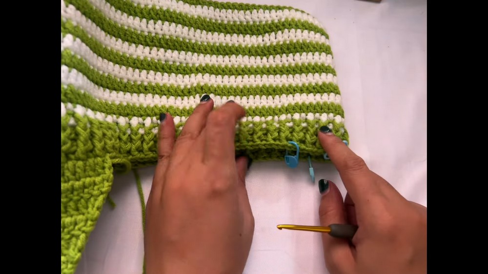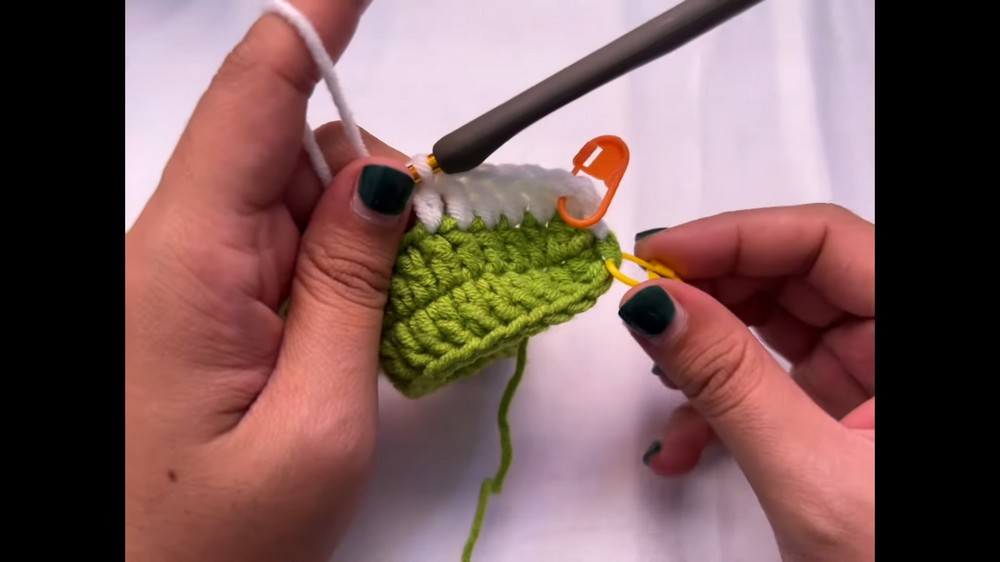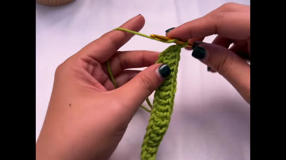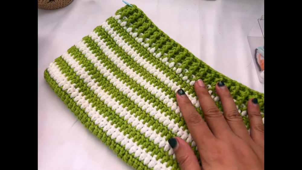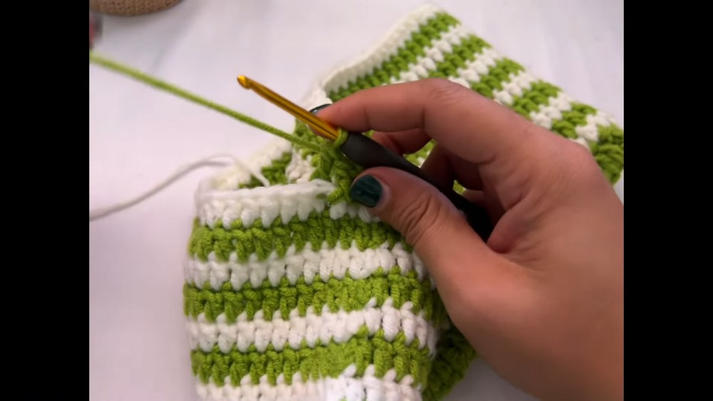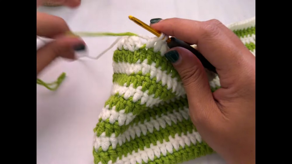 3. Continue working one double crochet per stitch in new color for desired number of rows (e.g., 7 rows of green).