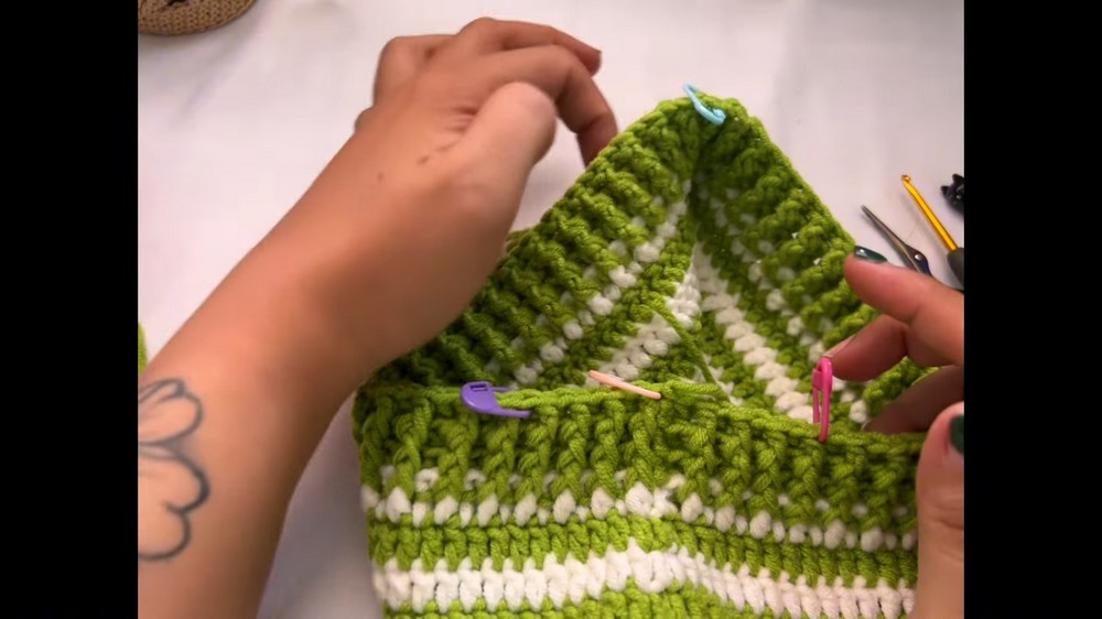 3. From each marker, count and mark 8 stitches inward for where ear flap will begin and end.