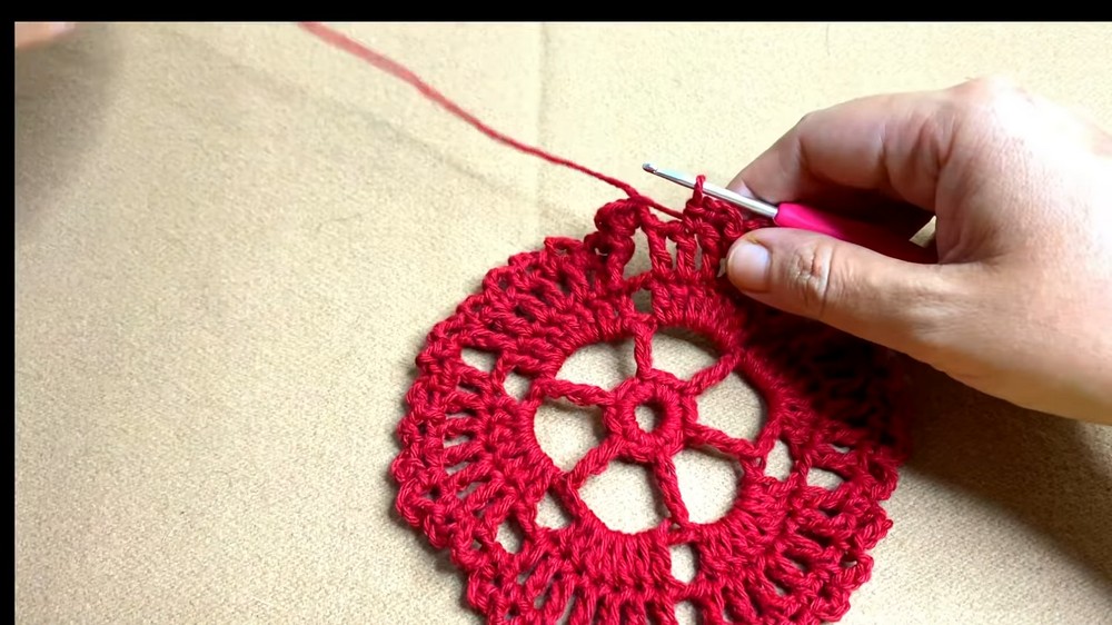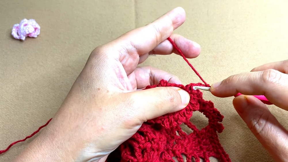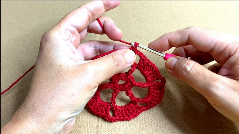 - After each single crochet group, add 3 chains and return to the stitch with a slip stitch to form the picot.