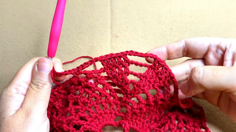 - In the first double crochet, work 2 dc, and in the next stitches, increase as the pattern grows outward.