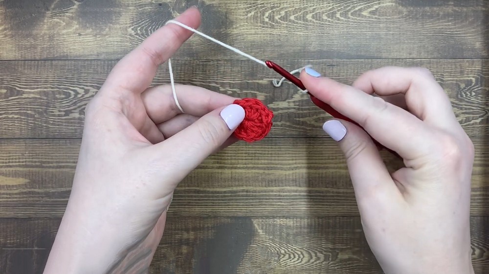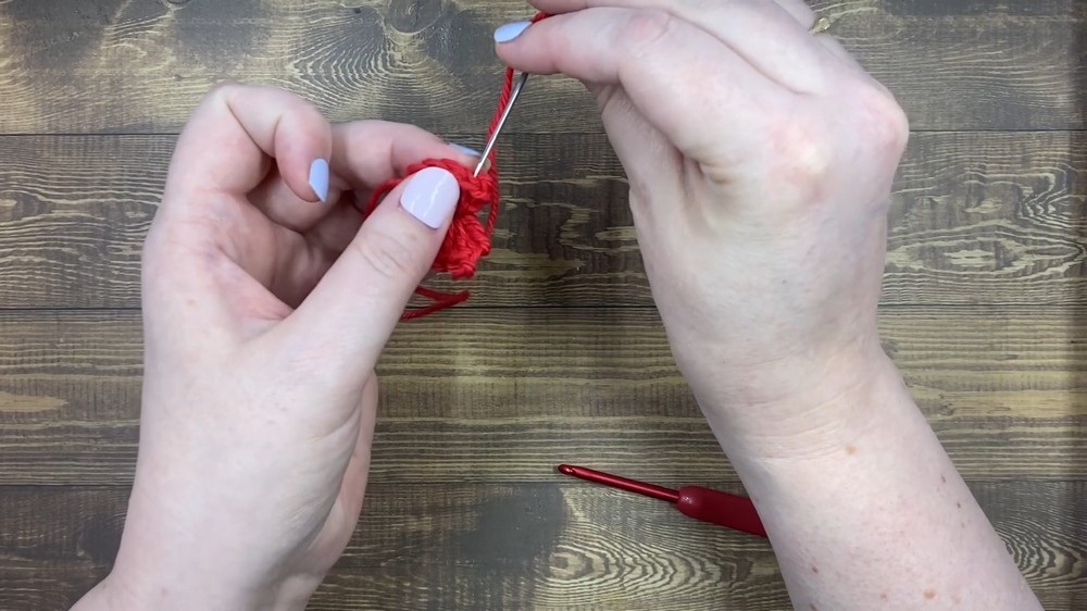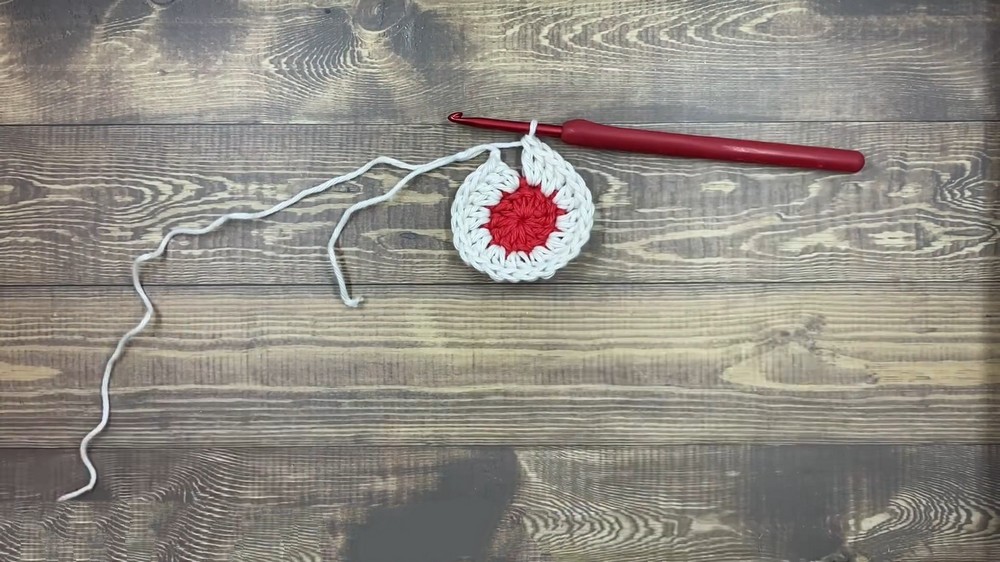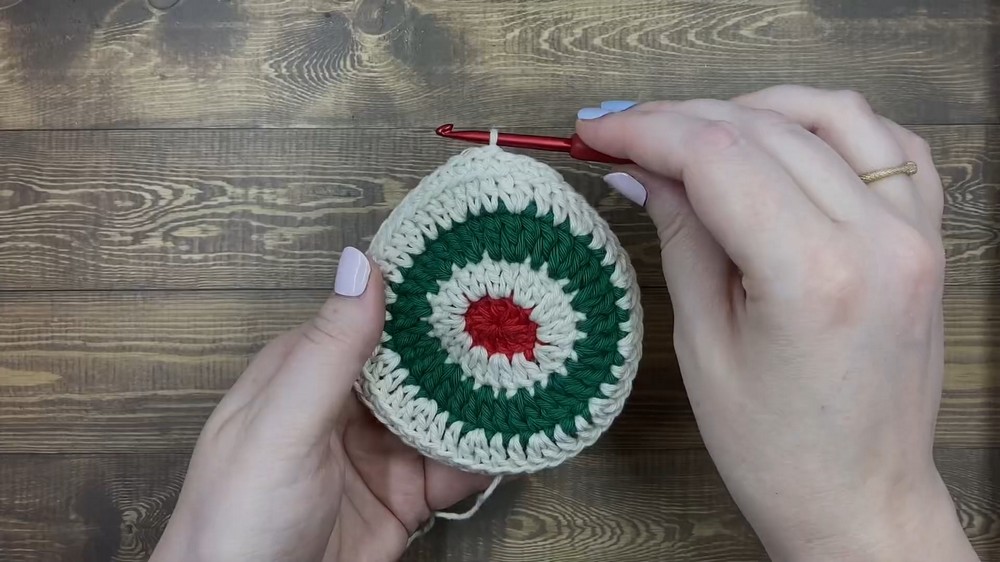 - Yarn: #3 weight yarn; cotton or cotton blend is recommended (it’s durable and heat-friendly). You can use 1-4 colors. The video features red, off-white, and green.
