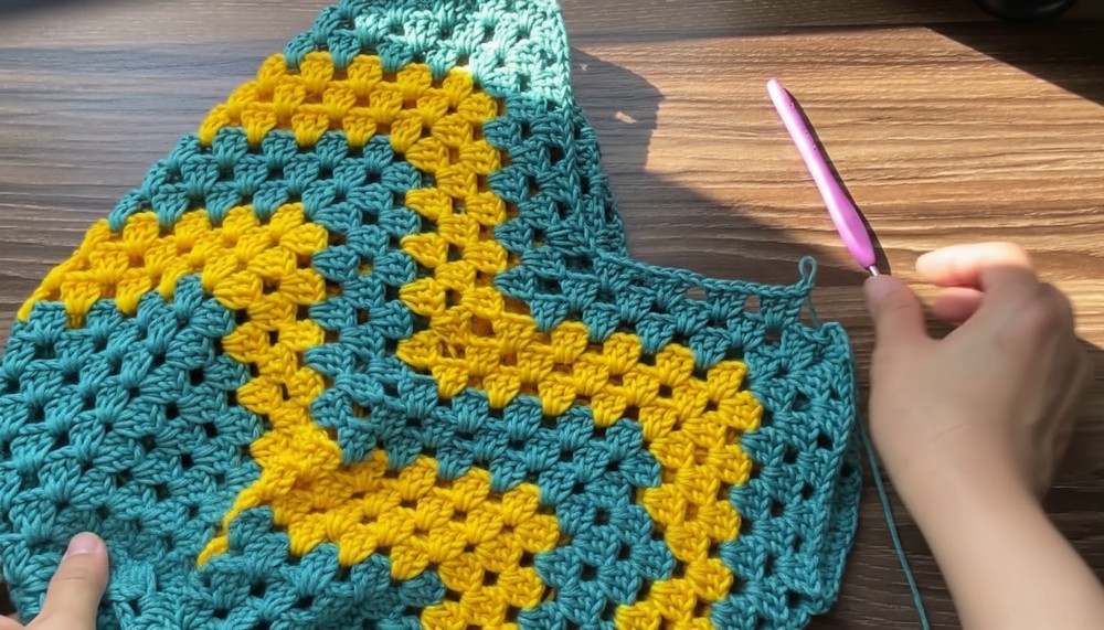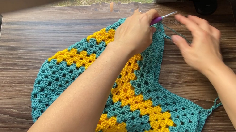 • After completing the desired bag height, create an opening by chaining a long length for the strap or crocheting directly into the sides for handles.
