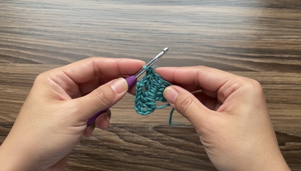 • Repeat 3 dc + ch 2 three more times until you have 4 clusters and 4 chain-2 corners.