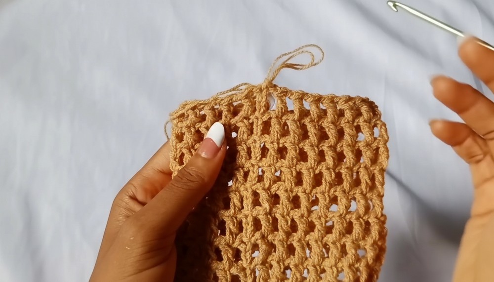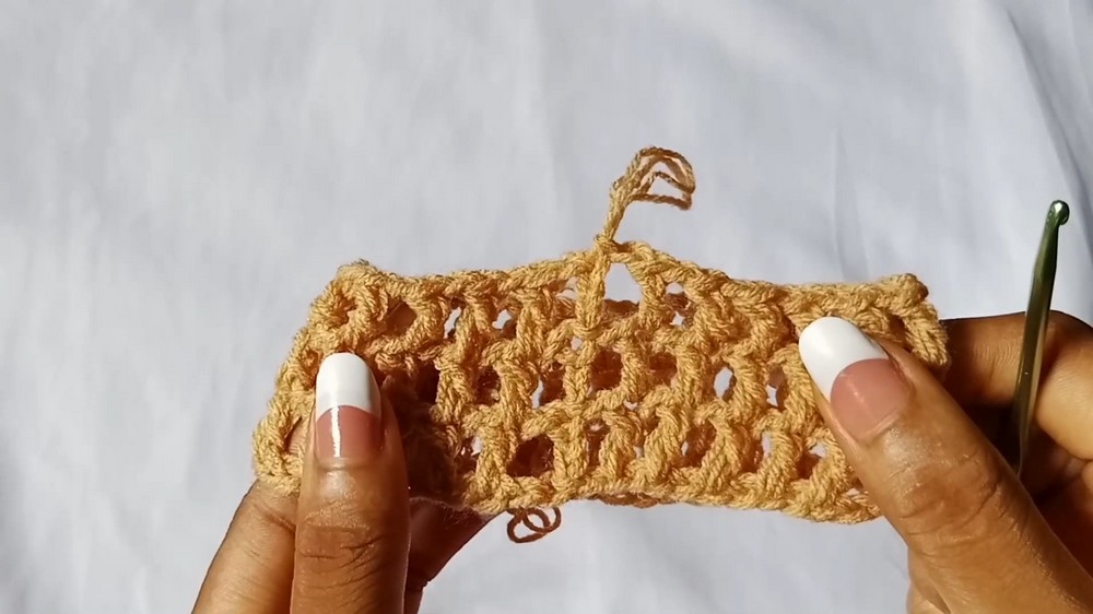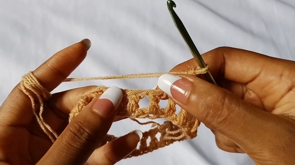 • Continue double crochet, chain 1 across until one stitch before the beginning chain 4 of the previous row.