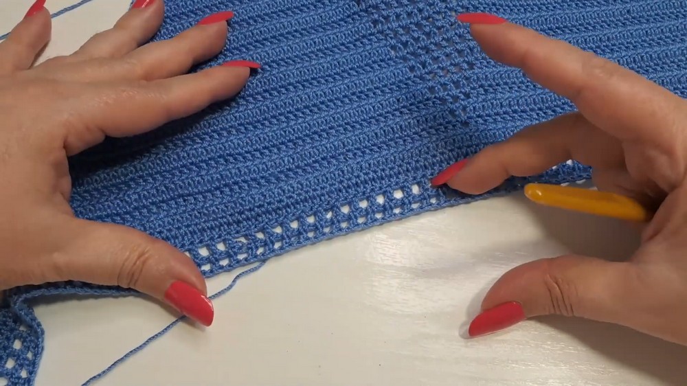 - Continue working dc dec on both ends and extending the space at the center as small squares by skipping stitches and chaining 1 over the skipped sts.