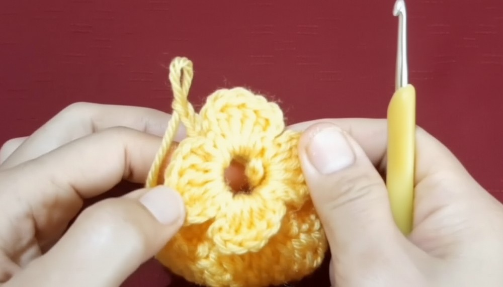 • In ch-7 spaces, work 5 dc with ch 4 between groups to form petals.