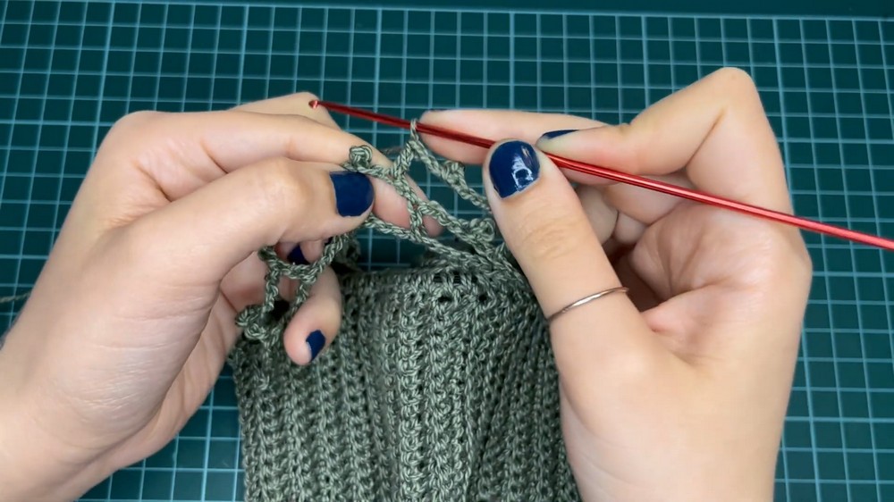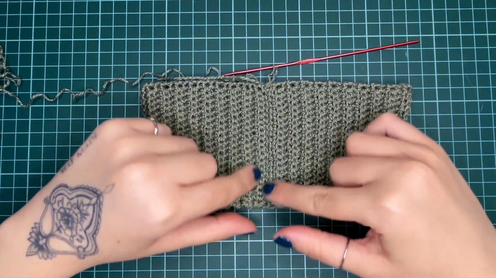 - Make single crochet (sc) stitches by inserting hook into the back loop only of each stitch to create ribbing texture.