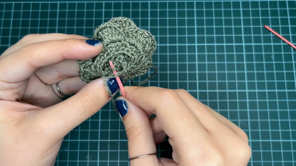 - Turn work and chain 1, then proceed with a petal pattern: chain 3, skip 2 stitches, sc, chain 3, repeat.