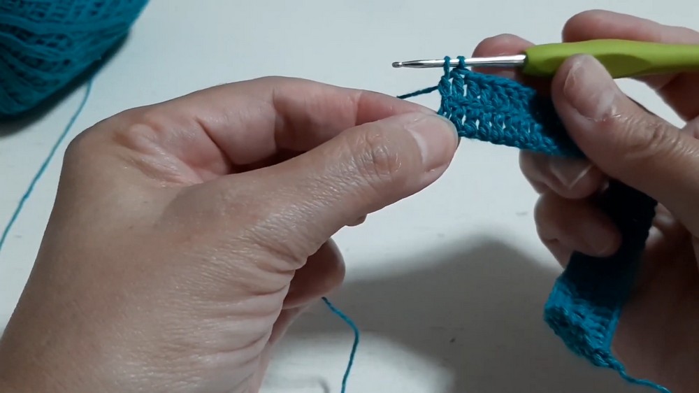 - Insert 5 single crochets alternating with 3 chain stitches across the width—this forms small open spaces (mesh effect).