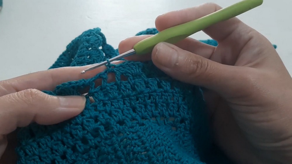 - Work alternating rows of single crochet stitches and chain spaces until you reach the desired height of the top. This creates a soft texture and breathable fabric.