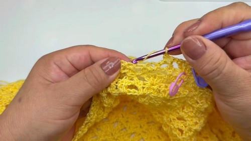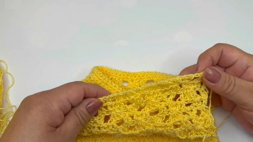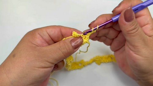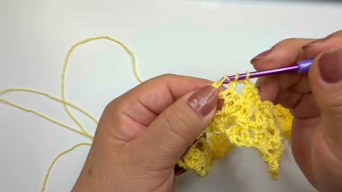 - Finish with 1 chain, skip 1 chain, and repeat the pattern.