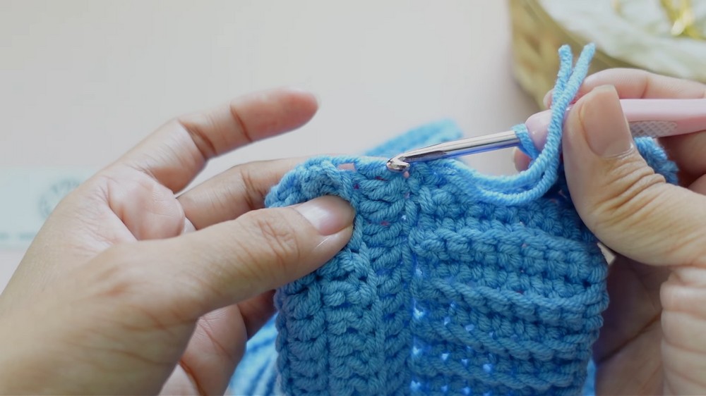 - Join yarn around the body’s bottom edge.