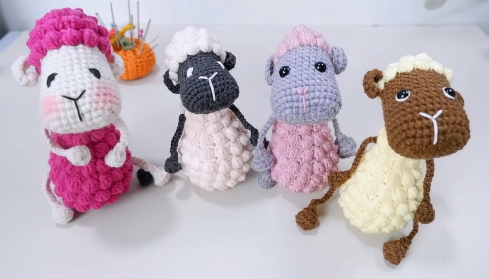• Includes details like crochet ears, limbs, and textured “wool” body.