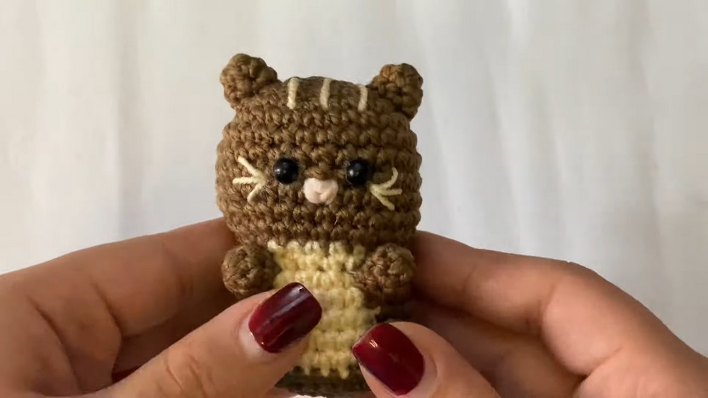 The tutor emphasizes the importance of the color change at Round 16 to ensure the stripes look even. When assembling, use pins to hold the ears and limbs in place before sewing to ensure the cat sits balanced. Use black thread to embroider a small “Y” shape for the nose and mouth between the eyes.