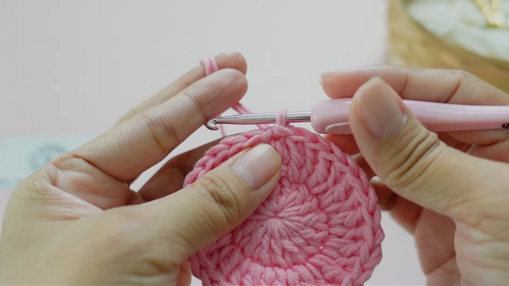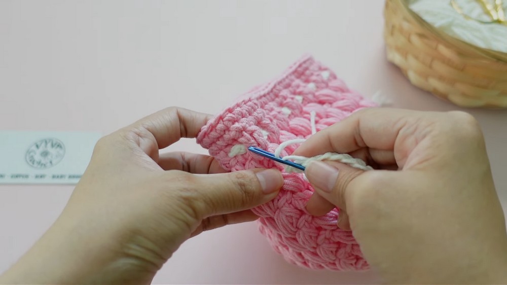- Make double crochet stitches evenly around, including into spaces between puff hearts.