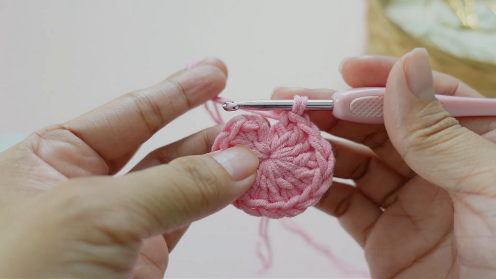 - Work puff heart stitches into the spaces between puff heart stitches from the previous row, maintaining the total count (15 puff hearts per round).