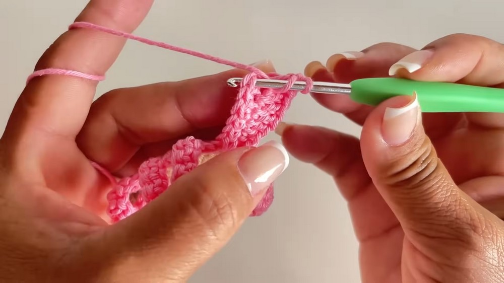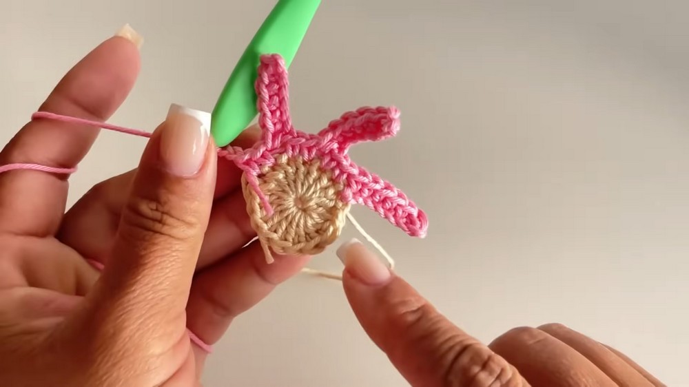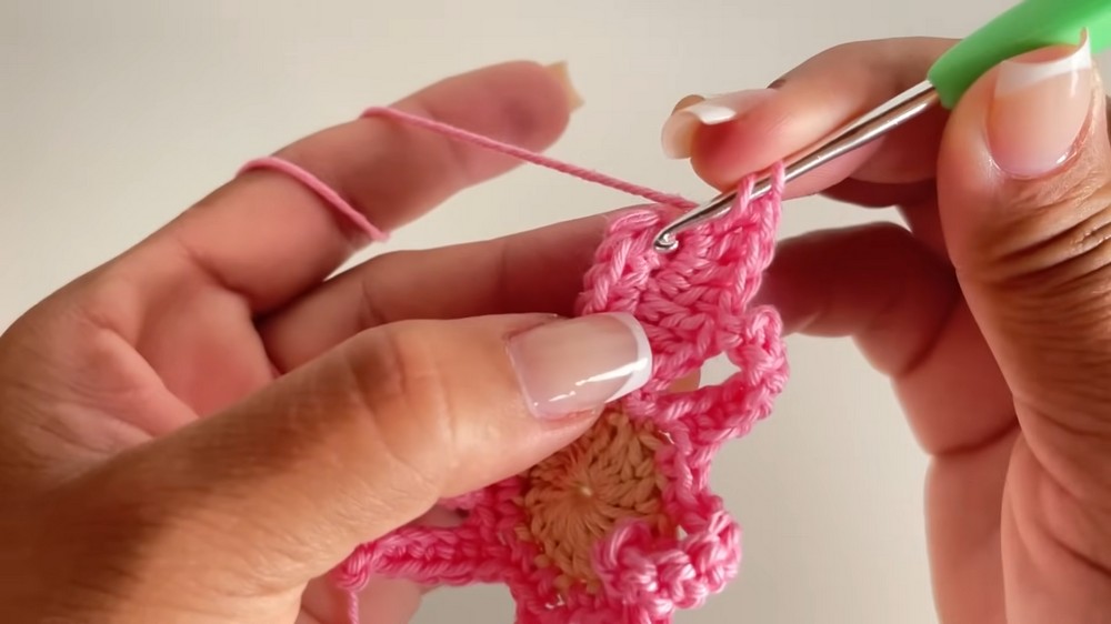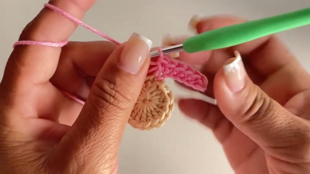 1. Attach Color 2 (pink or your desired petal color) into any stitch from the previous round using a Sl st.