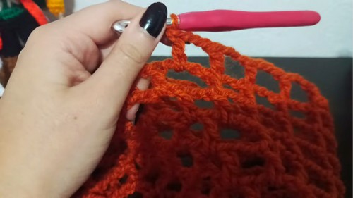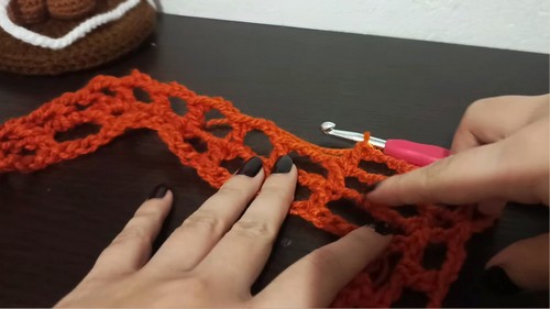 • Continue with mesh pattern (ch 3, dc in next dc) along the long edge, joining both layers together.