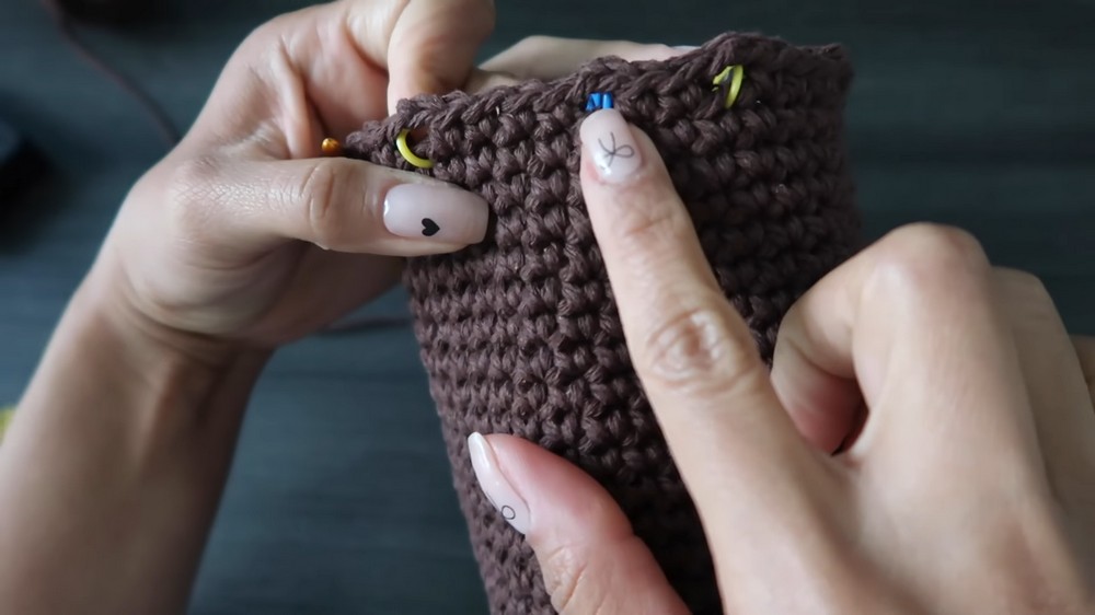 - Use stitch markers while creating strap holes for consistency and ease of tracking.