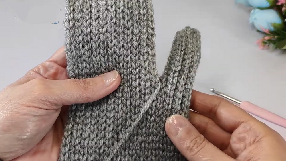 - Follow the same decrease logic as in the palm section, leaving 6 stitches unworked gradually as you progress.