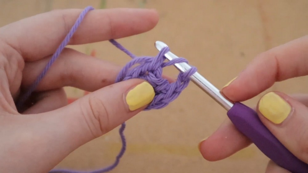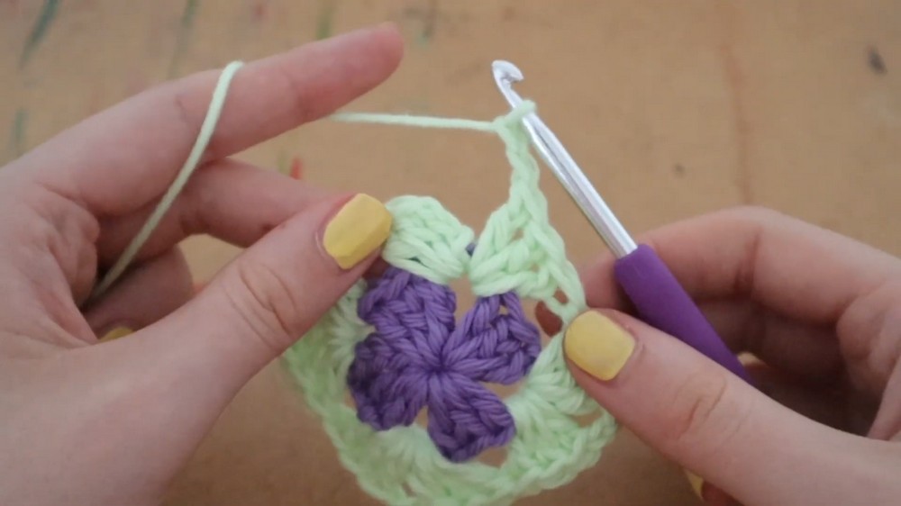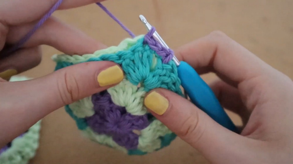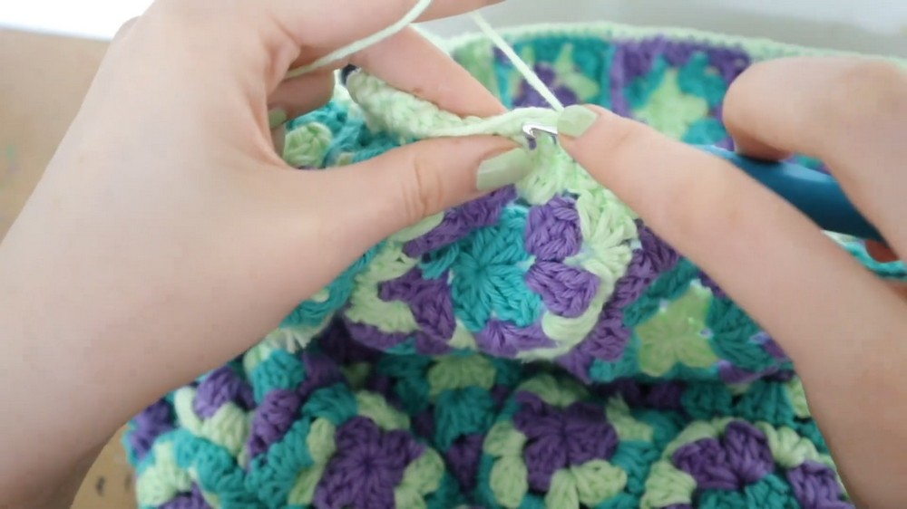 The making process begins by crocheting individual granny squares using simple stitches worked in rounds.