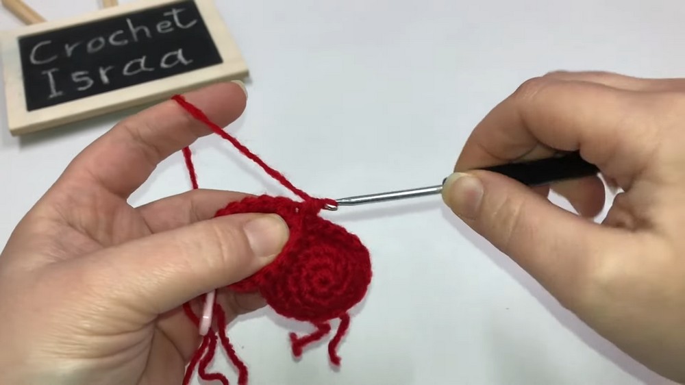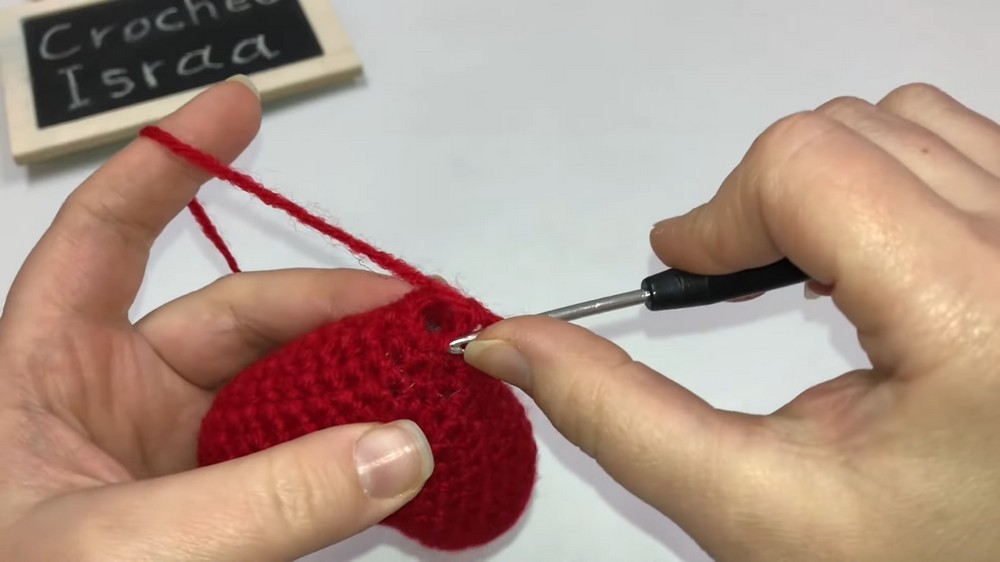 - Insert your hook into the top center stitch of the heart and attach new yarn.