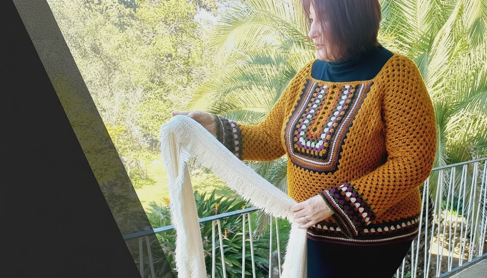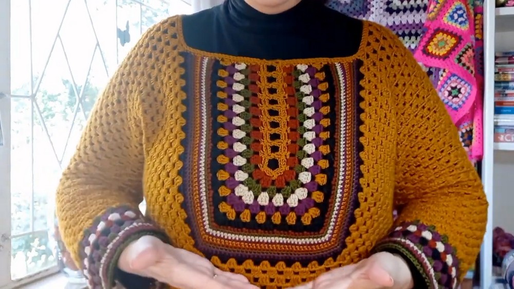 This retro granny square sweater blends classic crochet texture with modern boho style, offering customizable fit and vibrant color fun. Perfect for lovers of freestyle crochet, it allows creative expression through color changes and shaping.