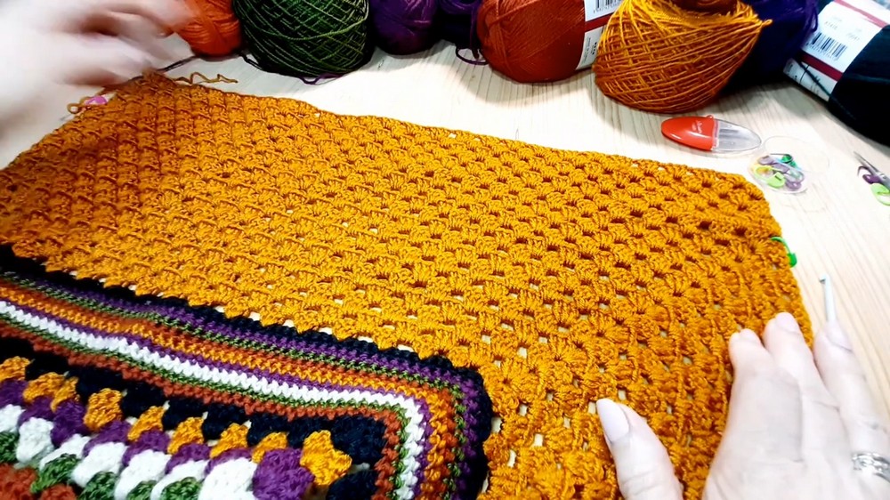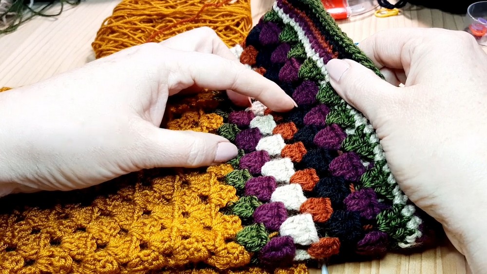 - Along bottom edge, work granny stitch clusters with occasional decreases over gaps to prevent “toothy” gaps.