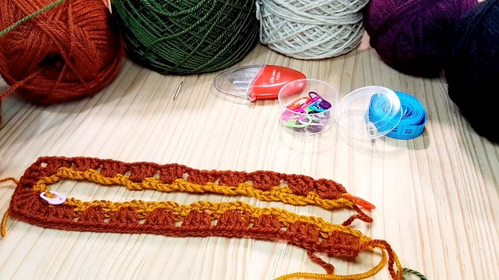- Classic granny stitch clusters with chain spaces create stretchy fabric