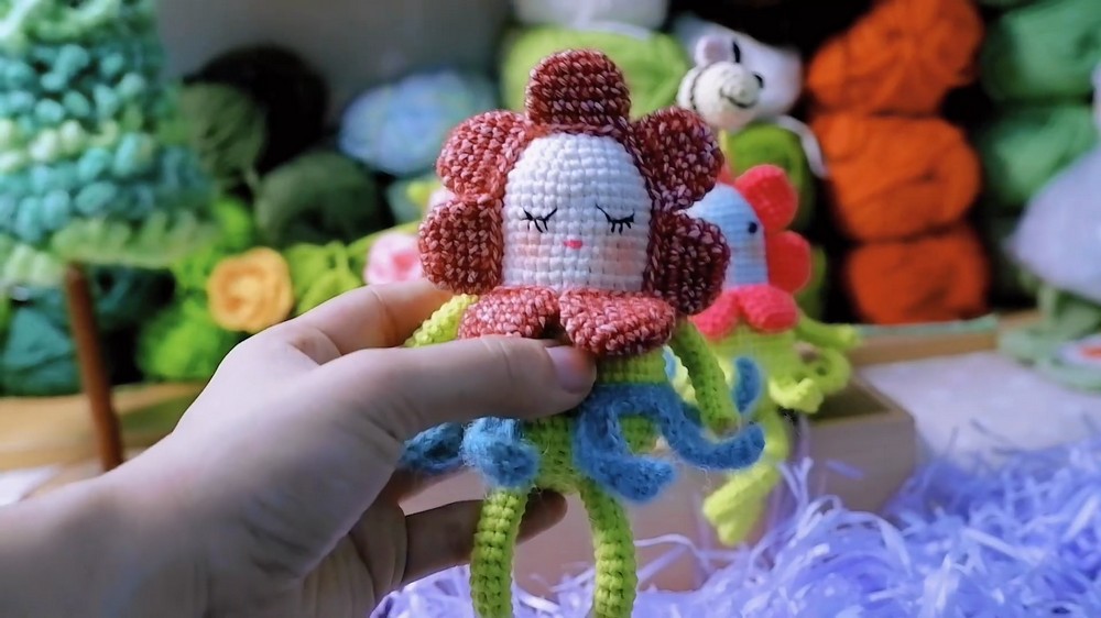 You can use it as a toy, a gift, or even a lovely piece to brighten up any room. It’s made with simple stitches and soft yarn, so it feels nice to hold and easy to care for. Whether you keep it on a shelf or play with it, this flower doll adds joy, color, and a touch of nature’s beauty all around. It’s a delightful handmade treasure that everyone will love!